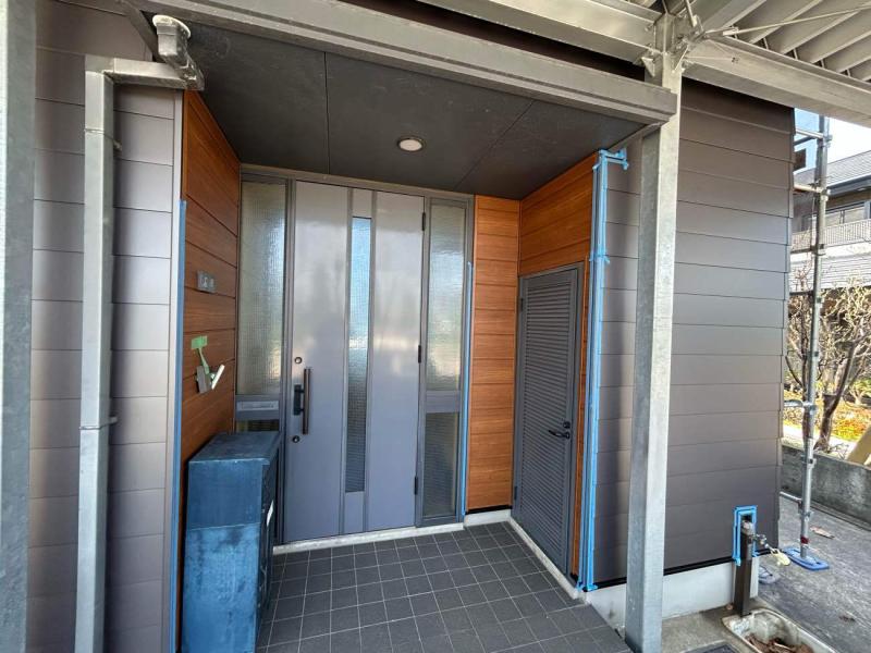 木目柄の鮮やかな茶色がとても良いアクセントになり、素敵な外観に!