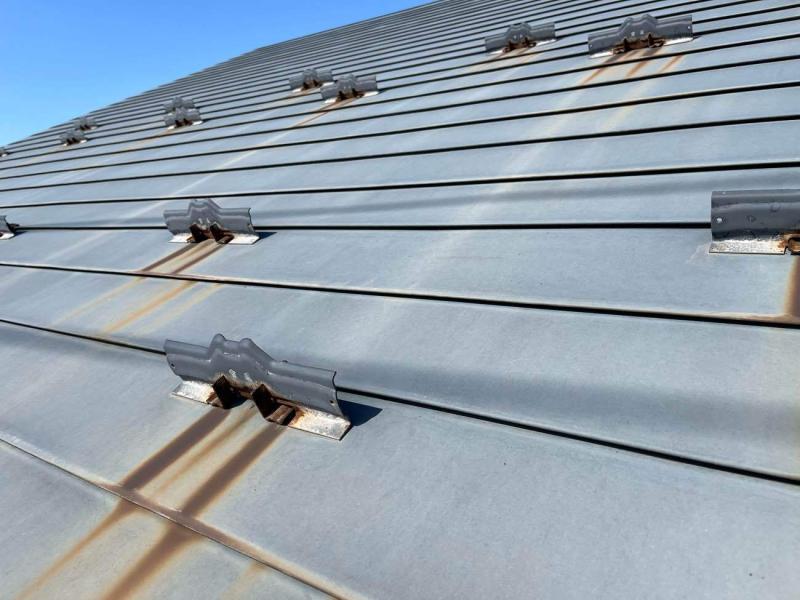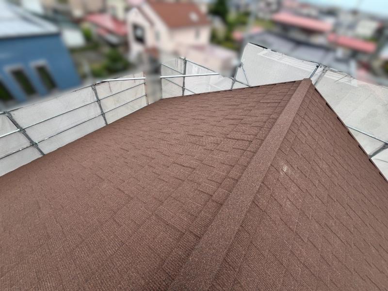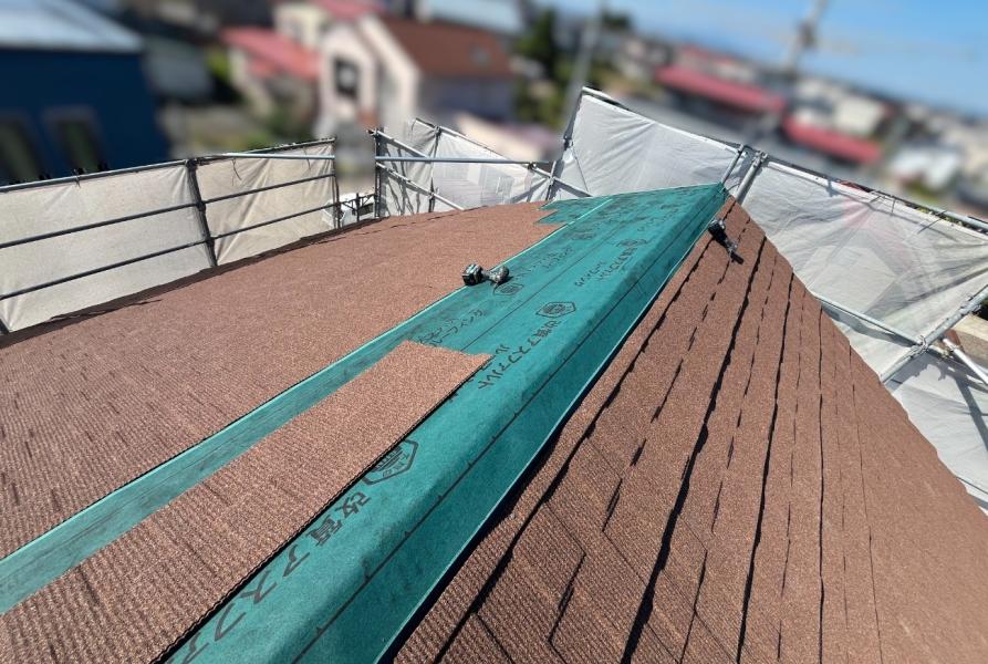 まず、既存屋根の上からルーフィングと呼ばれる防水シート貼っていきます。台風などの大雨や、梅雨時期の降雨など、屋根材だけでは防ぎきれずに侵入してきた雨水を、防水機能の高いルーフィングが防いでくれます。