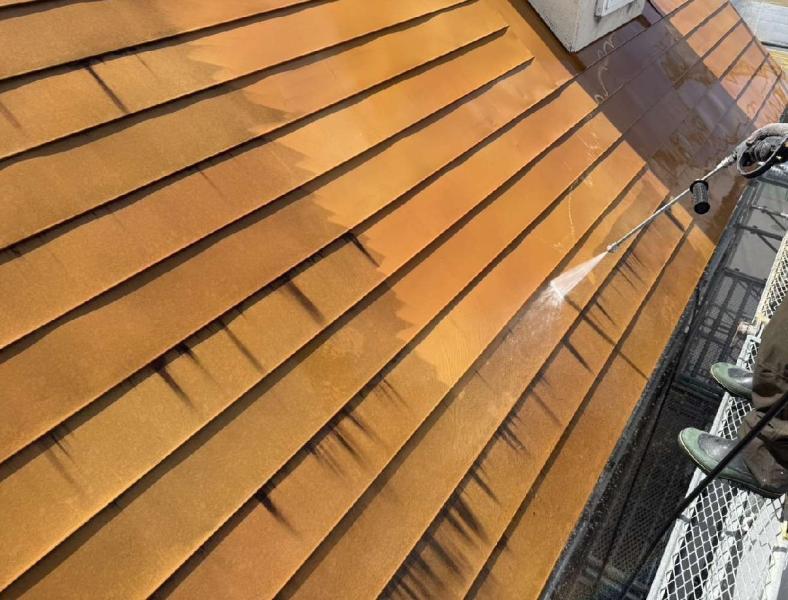 屋根は、高圧洗浄の前にケレン作業を行い、ケレン後の削りカスなども洗い流すために、高圧洗浄を行います。