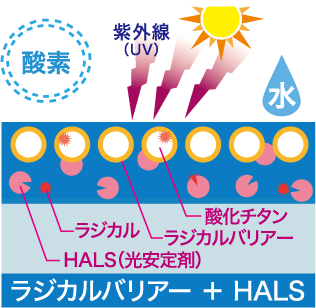 ラジカルバリアーでラジカルの発生を抑制。バリアーを突破したラジカルはHALS(光安定剤)により捕捉されます。