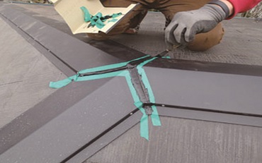 軒先から順番に本体を張っていきます。そのスタートになる軒先スターターや谷水切りなどの役物と呼ばれる板金を加工し取り付けます。